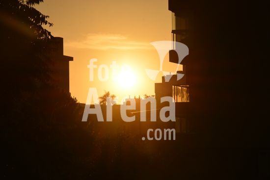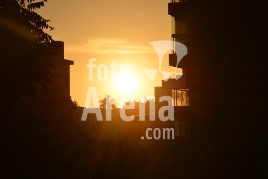 2843056 Imagens de clima/tempo nesta sexta-feira, com pôr-do-sol de céu claro, praticamente sem nuvens, entre prédios, iluminando um coqueiro . Caixas do Sul, RS (14).
