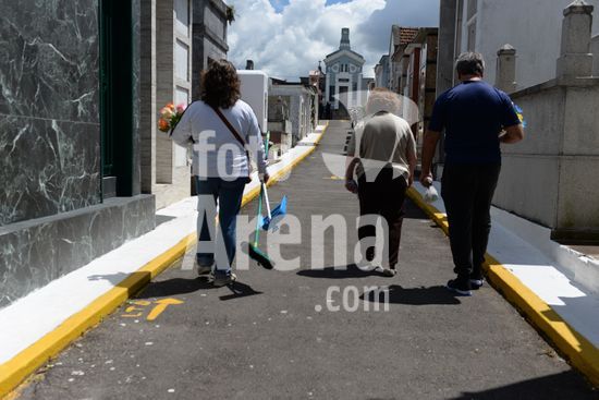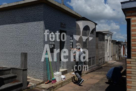 2833790 Imagens de pessoas realizando limpeza de jazigos e túmulos no Cemitério Público Municipal de Caxias do Sul, em preparação para as homenagens do Dia de Finados. O Cemitério Público Municipal de Caxias do Sul foi inaugurado em maio de 1901, quando o Estado cedeu ao município de Caxias do Sul uma área de 42.196 m². Antes dessa data os sepultamentos eram realizados no "antigo cemitério", situado entre as ruas Bento Gonçalves e Moreira César. O primeiro sepultamento neste cemitério foi o de Abramo Pezzi, no dia 6 de maio de 1903. Atualmente encontram-se sepultados aproximadamente 140 mil corpos, distribuídos em 5.200 lotes e 8.300 gavetas. Caxias do Sul, RS (01).
