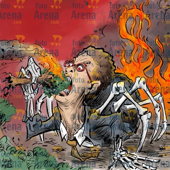 NAN2510307226 NANDO MOTTA, CRÍTICA SOCIAL E POLÍTICA, REDES SOCIAIS, 21.04.2021.Salles 2.Representação de Ricardo Salles como aranha e comendo uma árvore na queimada.