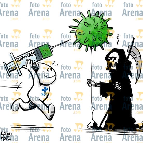 NAN2510307049 NANDO MOTTA, SAÚDE, REDES SOCIAIS, 08.01.2021.Vem vacina!Zé Gotinha com uma vacina nas mãos para vacinar o vírus e a imagem da morte.Butantan. Vacina brasileira.