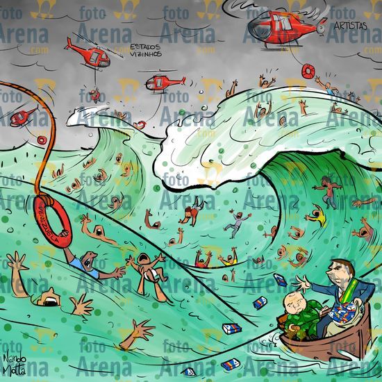 NAN2510305129 NANDO MOTTA, EPISÓDIOS SOCIAIS E POLÍTICOS, REDES SOCIAIS, 15.01.2021.SOS.Representação de Jair Bolsonaro e Eduardo Pazuello em um barco com o mar forte, Bolsonaro distribui caixas de remédio enquanto outros estados e artistas ajudam pessoas no mar.Estados vizinhos. Artistas.
