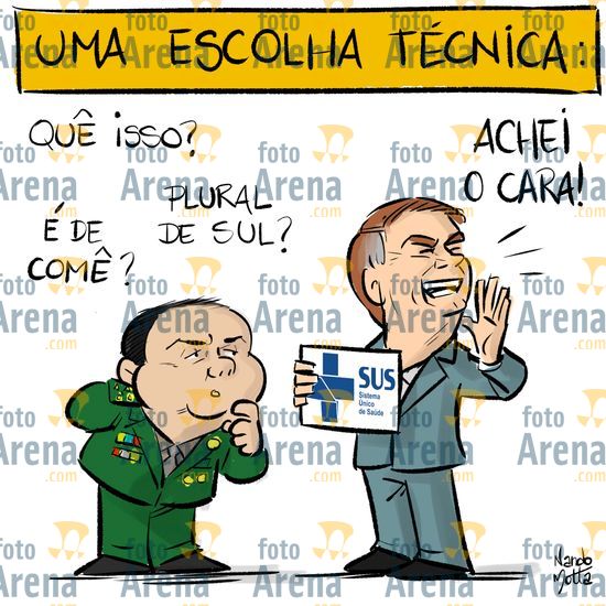 NAN2510307073 NANDO MOTTA, EPISÓDIOS SOCIAIS E POLÍTICOS, REDES SOCIAIS, 09.10.2020.SUS.Representação de Eduardo Pazuello e Jair Bolsonaro segurando uma placa do SUS (Sistema Único de Saúde).- Quê isso? Plural de Sul? É de comê?- Achei o cara!