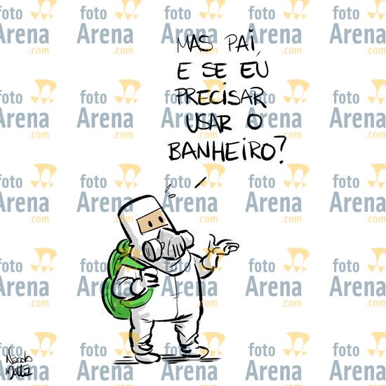 NAN2510303800 NANDO MOTTA, SAÚDE, REDES SOCIAIS, 29.07.2020.Volta as aulas.Criança com máscara e macacão de isolamento, usado na pandemia do Covid-19.- Mas pai, e se eu precisar usar o banheiro?