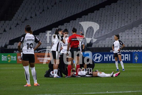 2911031 Gabi Zanotti sendo atendida após choque de cabeça na partida entre Corinthians X América-MG, válida pela quarta rodada do Campeonato Brasileiro Feminino Série A1 2026, nessa noite de segunda-feira (23), na Neo Química Arena.