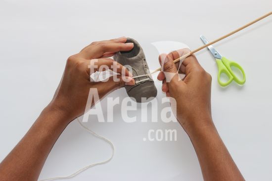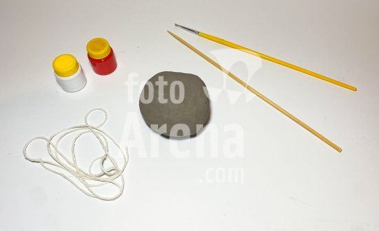 2860435 Passo a passo de processo de confecção de tênis feito com argila. Na foto, argila, tinta guache branca e vermelha, barbante, pincel e palito de churrasco.