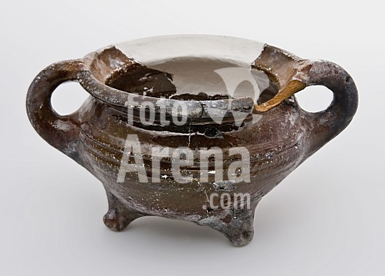 akg7073584 Pottery grape on three legs, two sausage ears, ribs and rings on the shoulder, grape cooking pot tableware holder utensils earthenware ceramics earthenware glaze lead glaze, hand turned glazed fried archeology Landpoortstraat Geervliet Bernisse indigenous pottery cooking kitchen nutrition food preparation Soil discovery: Geervliet waste pit barn Landpoortstraat 1 September 1983.