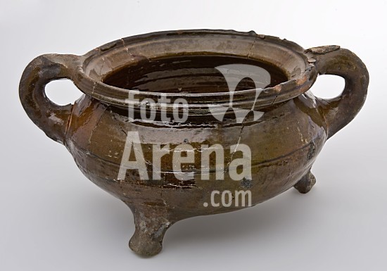 akg7077814 Pottery grape on three legs, low and wide model with wide neck opening, two sausage ears, grape cooking pot crockery holder kitchenware earthenware ceramics earthenware glaze lead glaze, hand-turned glazed baked Pottery grape on three legs Low and wide model with wide neck opening Red shard fully glazed except the bottom of the bottom. One groove around the belly as decoration. Two thick standing sausage ears Angled top edge profiled along the outside archeology Landpoortstraat Geervliet Bernisse indigenous pottery cooking kitchen nutrition food preparation Soil discovery: Geervliet waste pit barn Landpoortstraat 1 September 1983.