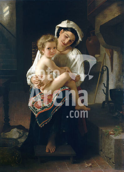 alb3608474 Young Mother Gazing at Her Child. Artist: William Bouguereau (French, La Rochelle 1825-1905 La Rochelle). Dimensions: 56 x 40 1/2 in. (142.2 x 102.9 cm). Date: 1871.This doting mother in picturesque dress and her angelic offspring are two of many such figures that Bouguereau painted with an eye to the international market. The scene is highly similar in subject and composition to Breton Brother and Sister, also dated 1871 (hanging nearby), and both works were bought by New York collectors--a testament to the popularity that the artist's scenes of "princesses dressed up as milkmaids" enjoyed in America. Museum: Metropolitan Museum of Art, New York, USA. Author: William Bouguereau.