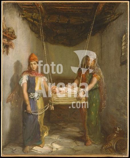 alb3615795 Scene in the Jewish Quarter of Constantine. Artist: Théodore Chassériau (French, Le Limon, Saint-Domingue, West Indies 1819-1856 Paris). Dimensions: 22 3/8 x 18 1/2 in. (56.8 x 47 cm). Date: 1851.Chassériau witnessed this scene and sketched it in his notebook during a trip to Algeria in 1846. From the ancient town of Constantine he wrote, "I have seen some highly curious things: primitive and overwhelming, touching and singular. At Constantine, which is high up in some enormous mountains, one sees the Arab people and the Jewish people [living] as they were at the beginning of time." The Jewish women of North Africa were especially attractive subjects for European painters because they did not wear veils. Museum: Metropolitan Museum of Art, New York, USA.
