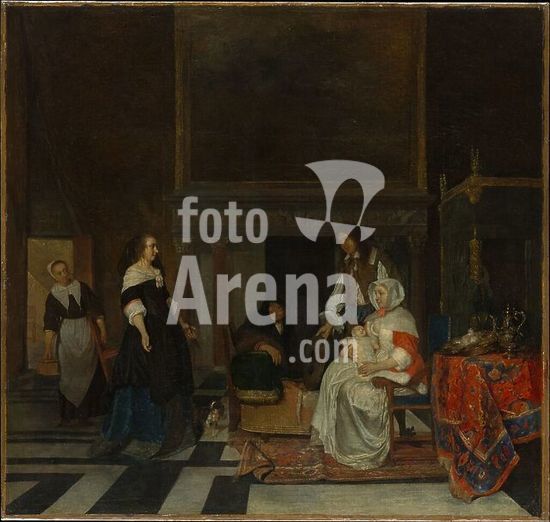 alb3617601 The Visit to the Nursery. Artist: Gabriël Metsu (Dutch, Leiden 1629-1667 Amsterdam). Dimensions: 30 1/2 x 32 in. (77.5 x 81.3 cm). Date: 1661.In an impressively appointed room, modeled on a large chamber in the new Town Hall of Amsterdam, the parents of a newborn baby receive a fashionable well-wisher. Such a kraambezoek (cradle visit) was a minor ritual of polite society. At least two of the poses recall figures by one of Holland's closest observers of modern manners, Gerard ter Borch. The painting was celebrated in its own time--for example, in a poem by Jan Vos of 1662--but unfortunately its surface is badly worn from cleanings in the past. Museum: Metropolitan Museum of Art, New York, USA.