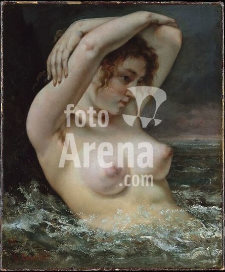 alb3644350 The Woman in the Waves. Artist: Gustave Courbet (French, Ornans 1819-1877 La Tour-de-Peilz). Dimensions: 25 3/4 x 21 1/4 in. (65.4 x 54 cm). Date: 1868.Between 1864 and 1868 Courbet undertook a series of paintings of the female nude. He could not have failed to witness the triumph of Alexandre Cabanel's Birth of Venus (Musée d'Orsay, Paris) at the Salon of 1863, along with the popularity of similar representations by Cabanel's fellow academicians. Here, Courbet evokes the myth of Venus, the goddess born of the sea, but slyly subverts convention by depicting the model's underarm hair--an element of realism amplified by the almost palpable quality of her flesh. Museum: Metropolitan Museum of Art, New York, USA.