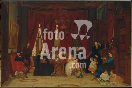 alb3655383 The Hatch Family. Artist: Eastman Johnson (American, Lovell, Maine 1824-1906 New York). Dimensions: 48 x 73 3/8 in. (121.9 x 186.4 cm). Date: 1870-71.Alfrederick Smith Hatch (1829-1904) was a prominent Wall Street broker in the firm of Fisk and Hatch and president of the New York Stock Exchange from 1883 to 1884. Like many of his business associates, he was an enthusiastic collector of art. One of the finest paintings in his collection was this commissioned group portrait showing three generations of his family. It depicts them in the library of their New York residence at 49 Park Avenue, on the northeast corner of 39th Street. Hatch is seated to the right at his desk, and his wife, the former Theodosia Ruggles (1829-1908), leans on the mantel. Other members of the family, including Theodosia's mother, Hatch's father, and their children are also present. Museum: Metropolitan Museum of Art, New York, USA.