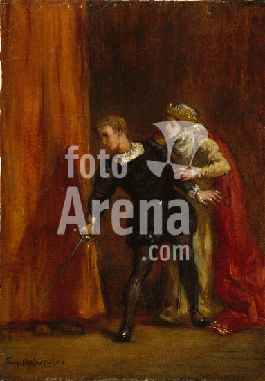 alb3673648 Hamlet and His Mother. Artist: Eugène Delacroix (French, Charenton-Saint-Maurice 1798-1863 Paris). Dimensions: 10 3/4 x 7 1/8 in. (27.3 x 18.1 cm). Date: 1849.This painting depicts the moment in Shakespeare's epic tragedy Hamlet in which the protagonist, who has been speaking privately with his mother, Queen Gertrude of Denmark, notices a figure behind the curtains of her closet. Immediately afterward, Hamlet will impale the hidden Polonius with his sword, and utter the memorable phrase "How now! A rat? Dead for a ducat, dead!" The composition is identical to a black and white lithograph Delacroix made for a portfolio devoted to the play, which was first published in 1843. Museum: Metropolitan Museum of Art, New York, USA.