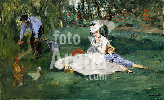 alb3679186 The Monet Family in Their Garden at Argenteuil. Artist: Édouard Manet (French, Paris 1832-1883 Paris). Dimensions: 24 x 39 1/4 in. (61 x 99.7 cm). Date: 1874.In July and August 1874 Manet vacationed at his family's house in Gennevilliers, just across the Seine from Monet at Argenteuil. The two painters saw each other often that summer, and on a number of occasions they were joined by Renoir. While Manet was painting this picture of Monet with his wife Camille and their son Jean, Monet painted Manet at his easel (location unknown). Renoir, who arrived just as Manet was beginning to work, borrowed paint, brushes, and canvas, positioned himself next to Manet, and painted Madame Monet and Her Son (National Gallery of Art, Washington, D.C.). Museum: Metropolitan Museum of Art, New York, USA.
