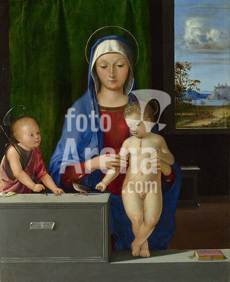 alb3891711 The Virgin and Child with Saint John. Date/Period: Between ca. 1500 and ca. 1510. Painting. Oil on canvas (transferred from wood). Height: 36.5 cm (14.3 in); Width: 29.8 cm (11.7 in). Author: ANTONIO SOLARIO.