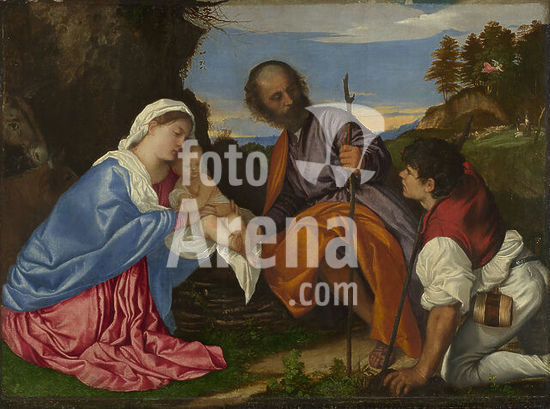 alb3906562 The Holy Family with a Shepherd. Date/Period: 1510. Painting. Oil on canvas. Height: 99.1 cm (39 in); Width: 139.1 cm (54.7 in). Author: TITIAN.