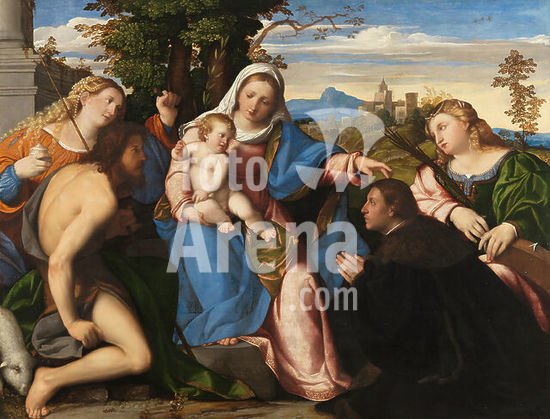alb4156864 Palma Vecchio (Serina, 1479/80 - Venice, 1528). The Virgin and Child with Saints and a Donor (ca. 1518 - 1520). Oil on panel transferred to canvas. 105 x 136 cm. Museum: Museo Nacional Thyssen-Bornemisza, Madrid. Author: Palma Vecchio (Jacopo Nigretti).