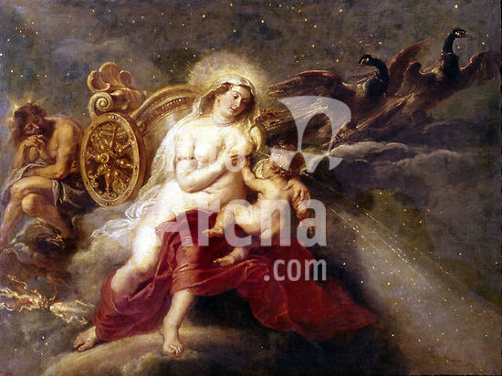alb3669064 Mars and Venus United by Love. Artist: Paolo Veronese (Paolo Caliari) (Italian, Verona 1528-1588 Venice). Dimensions: 81 x 63 3/8 in. (205.7 x 161 cm). Date: 1570s.In this visually opulent and sensual painting, Cupid binds Mars (the god of war) to Venus with a love knot. It celebrates the civilizing and nurturing effects of love, as milk flows from Venus's breast and Mars's warhorse is restrained. By 1621 the painting was owned by Emperor Rudolf II in Prague, along with other mythological works by the artist (two are in the Frick Collection, New York), but its original owner is unknown. A masterpiece of light and color, works such as this had an enduring impact on later artists including Velázquez and Giambattista Tiepolo. Museum: Metropolitan Museum of Art, New York, USA.