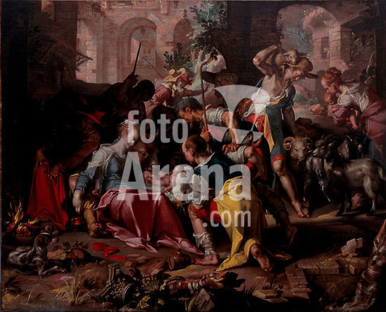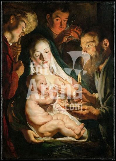 alb3605217 The Holy Family with Shepherds. Artist: Jacob Jordaens (Flemish, Antwerp 1593-1678 Antwerp). Dimensions: 42 x 30 in. (106.7 x 76.2 cm). Date: 1616.The date of 1616 on the tall shepherd's hat is the earliest known on any work by Jordaens. He never went to Italy but intensified the Caravaggesque qualities found in works by Rubens and other Antwerp artists such as Abraham Janssens. His handling of light and shadow and closely clustered figure groups convey a sense of intimacy that is distinctive of the young Jordaens. Museum: Metropolitan Museum of Art, New York, USA.