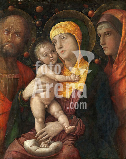 alb3624332 The Holy Family with Saint Mary Magdalen. Artist: Andrea Mantegna (Italian, Isola di Carturo 1430/31-1506 Mantua). Dimensions: 22 1/2 x 18 in. (57.2 x 45.7 cm). Date: ca. 1495-1500.The composition of this late picture by Mantegna was inspired by Roman funerary reliefs, which accounts for the combination of austerity and sweetness. It is painted in distemper rather than oil, allowing the artist to give strong definition to the forms. Originally, the colors would have had a freshness and clarity. However, the picture has suffered from past cleanings and its surface has been varnished, compromising the intended effect. Mantegna painted for the elite Gonzaga court in Mantua, where the antiquarian culture informing this picture would have been appreciated. Museum: Metropolitan Museum of Art, New York, USA.