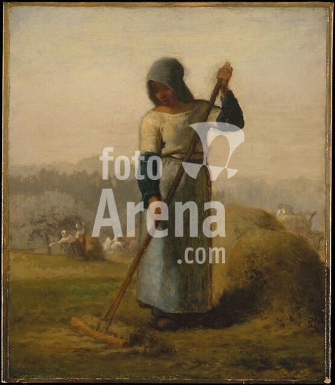 alb3626305 Woman with a Rake. Artist: Jean-François Millet (French, Gruchy 1814-1875 Barbizon). Dimensions: 15 5/8 x 13 1/2 in. (39.7 x 34.3 cm). Date: probably 1856-57.Millet first treated this subject in a woodcut, one of ten in the series Labors of the Fields that were published in a popular periodical in 1853. The art dealer Martinet, in whose gallery such avant-garde artists as Courbet and Manet exhibited, included this painting in a show in 1860. Museum: Metropolitan Museum of Art, New York, USA.