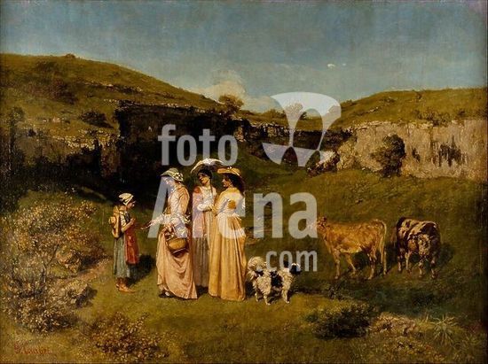 alb3656573 Young Ladies of the Village. Artist: Gustave Courbet (French, Ornans 1819-1877 La Tour-de-Peilz). Dimensions: 76 3/4 x 102 3/4 in. (194.9 x 261 cm). Date: 1851-52.This painting, which initiated a series of pictures devoted to the lives of women, shows Courbet's three sisters--Zélie, Juliette, and Zoé--strolling in the Communal, a small valley near his native village of Ornans. One of the girls offers alms to a young cowherd. Courbet had high hopes for the work, but when it was exhibited at the Salon of 1852, critics attacked it as tasteless and clumsy. They reviled the models' common features and countrified costumes, the "ridiculous" little dog and cattle, and the overall lack of unity, including traditional perspective and scale. Museum: Metropolitan Museum of Art, New York, USA.