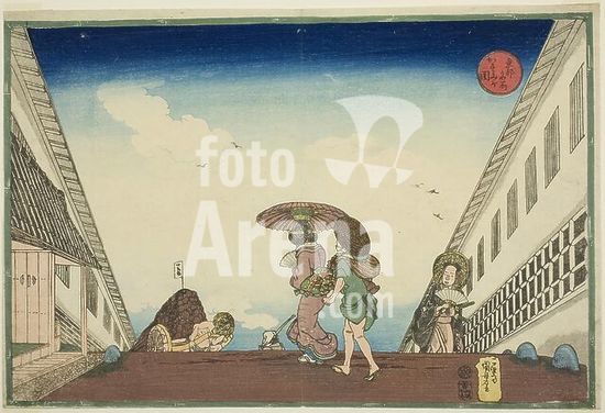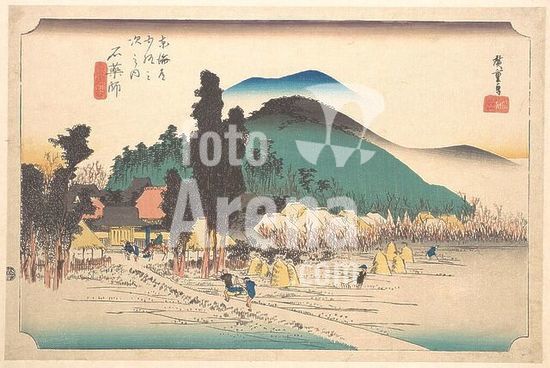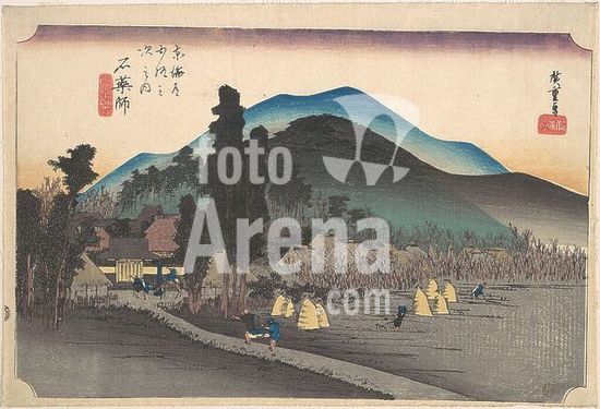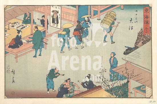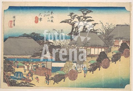 alb3626732 Otsu. Artist: Utagawa Hiroshige (Japanese, Tokyo (Edo) 1797-1858 Tokyo (Edo)). Culture: Japan. Dimensions: Overall: 8 3/4 x 13 3/4in. (22.2 x 34.9cm). Date: ca. 1840.The highway called the Tokaido stretched about 290 miles from Nihonbashi in the center of Edo to the Great Sanjo Bridge in Kyoto, a journey of ten days or two weeks. Between Edo and Kyoto, fifty-three stations served the travelers' needs. All along the Tokaido, the grandeur of spectacular landscapes and seascapes was punctuated with a variety of human activities. This print vividly illustrates travelers on a busy street of the Otsu station from a bird's-eye view in an oblique perspective commonly featured in East Asia.This series of the Fifty-three Stations of the Tokaido, published in 1848-49, is popularly known as the "Reisho Tokaido" from the archaic style of the calligraphy in the cartouche of each print. Another series, published in 1833-34, is more widely known. Museum: Metropolitan Museum of Art, New York, USA.