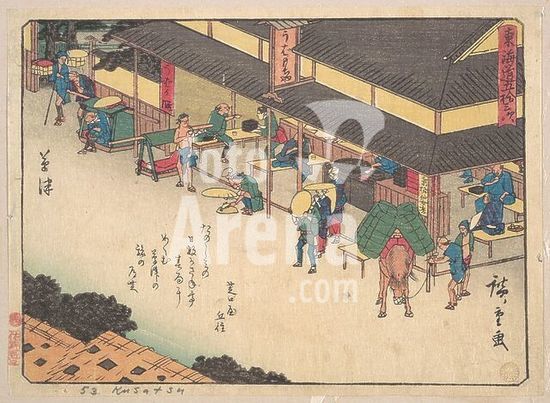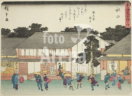 alb4153361 Minakuchi, from the series "Fifty-three Stations of the Tokaido (Tokaido gojusan tsugi)," also known as the Tokaido with Poem (Kyoka iri Tokaido). Utagawa Hiroshige ?? ??; Japanese, 1797-1858. Date: 1832-1847. Dimensions: 17 x 22.9 cm (6 11/16 x 9 in.). Color woodblock print; chuban. Origin: Japan. Museum: The Chicago Art Institute, USA.