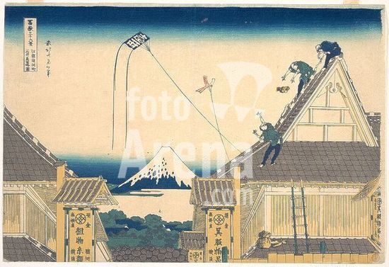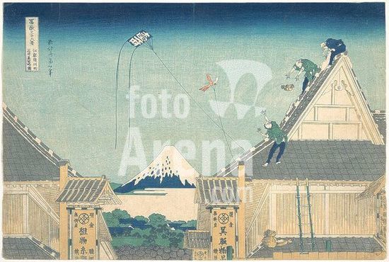 alb3630691 Mitsui Shop at Surugacho in Edo (Edo Surugacho Mitsui mise ryaku zu), from the series Thirty-six Views of Mount Fuji (Fugaku sanjurokkei). Artist: Katsushika Hokusai (Japanese, Tokyo (Edo) 1760-1849 Tokyo (Edo)). Culture: Japan. Dimensions: Oban 10 x 15 in. (25.4 x 38.1 cm). Date: ca. 1830-32.The celebrated kimono shop of the Mitsui family, Echigoya, was located on Edo's busiest street, Surugacho. Mount Fuji is glimpsed from a high vantage point above the street between Echigoya's two buildings. The triangular profile of the roof is echoed in the shape of the mountain. Museum: Metropolitan Museum of Art, New York, USA.