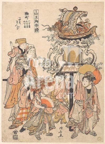 alb3628878 Kodomo Mando, Kojimachi 1,2, 3-chome, Sanno Go-saireiChildrens' Lantern Float, Kojimachi 1,2, 3-chome Block Association, Sanno Festival. Artist: Torii Kiyonaga (Japanese, 1752-1815). Culture: Japan. Dimensions: H. 10 1/4 in. (26 cm); W. 7 1/2 in. (19.1 cm). Date: ca. 1780.Since Edo times, the Sanno Festival has been celebrated in alternate years in the sixth month at the Hie Shrine in Tokyo. Because one of the deities associated with the shrine, Sanno Gongen, was a tutelary deity of the Tokugawa family, the festival enjoyed shogunal patronage. Then, as now, neighborhood groups carried portable shrines (mikoshi) and paraded floats of their own design through the streets and into Edo castle. Museum: Metropolitan Museum of Art, New York, USA.