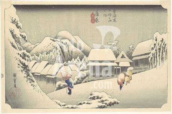 alb3635808 Evening Snow at Kanbara, from the series "Fifty-three Stations of the Tokaido". Artist: Utagawa Hiroshige (Japanese, Tokyo (Edo) 1797-1858 Tokyo (Edo)). Culture: Japan. Dimensions: 8 7/8 x 13 3/4 in. (22.5 x 34.9 cm). Date: ca. 1833-34.Deep snow covers the slope of Kanbara in the evening. Fresh flakes falling on the houses, trees, and mountains create a quiet that is broken only by the implied crunch of travelers' footsteps in the snow. This scene is almost entirely imaginary; it rarely snows in the Kanbara area, in present-day Shizuoka Prefecture. Museum: Metropolitan Museum of Art, New York, USA.