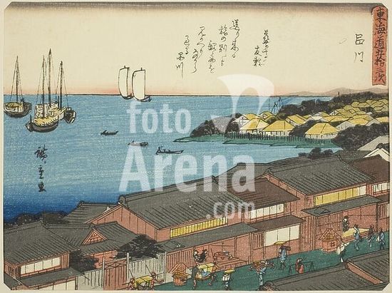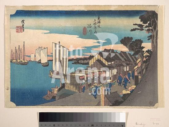 alb4153440 Shinagawa, from the series "Fifty-three Stations of the Tokaido (Tokaido gojusan tsugi)," also known as the Tokaido with Poem (Kyoka iri Tokaido). Utagawa Hiroshige ?? ??; Japanese, 1797-1858. Date: 1832-1847. Dimensions: 17.1 × 23 cm (6 11/16 × 9 1/16 in.). Color woodblock print; chuban. Origin: Japan. Museum: The Chicago Art Institute, USA.