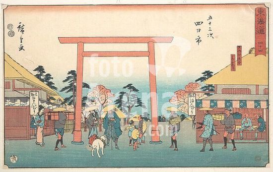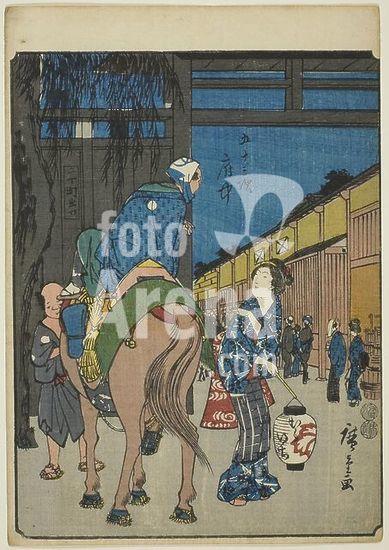 alb4153366 Fuchu: View of the Licensed Quarter in Nichomachi (Fuchu, Nichomachi kuruwa no zu), from the series "Fifty-three Stations of the Tokaido (Tokaido gojusan tsugi)," also known as the Tokaido with Poem (Kyoka iri Tokaido). Utagawa Hiroshige ?? ??; Japanese, 1797-1858. Date: 1832-1847. Dimensions: 16.7 × 22.8 cm (6 9/16 × 8 15/16 in.). Color woodblock print; chuban. Origin: Japan. Museum: The Chicago Art Institute, USA.