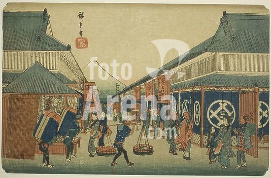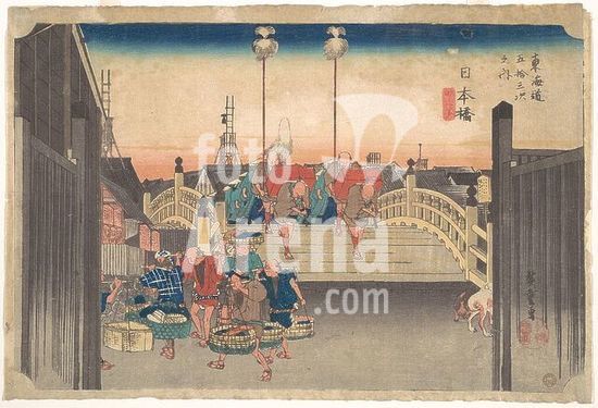 alb3674010 Stations One: Morning View of Nihonbashi. Artist: Utagawa Hiroshige (Japanese, Tokyo (Edo) 1797-1858 Tokyo (Edo)). Culture: Japan. Dimensions: H. 9 1/2 in. (24.1 cm); W. 13 7/8 in. (35.2 cm). Date: ca. 1833-34.At the Nihonbashi Bridge, the starting point of the Tokaido, a daimyo procession crosses early in the morning as it begins its long journey out of Edo and toward the open gates of the district. Ahead of the group are the fishmongers who carry fresh fish from the nearby market into the city. Museum: Metropolitan Museum of Art, New York, USA.
