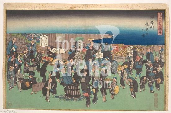alb3682631 Junkei machi Yomise no Zu. Artist: Utagawa Hiroshige (Japanese, Tokyo (Edo) 1797-1858 Tokyo (Edo)). Culture: Japan. Dimensions: H. 9 1/4 in. (23.5 cm); W. 14 3/16 in. (36 cm). Date: ca. 1828. Museum: Metropolitan Museum of Art, New York, USA.