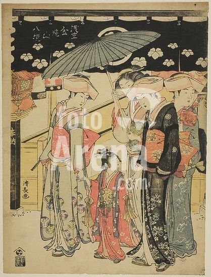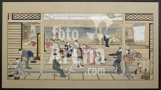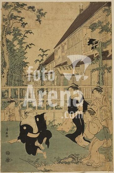 alb4144011 Outdoor Amusements at the Kankanro Teahouse in Yoshiwara. Torii Kiyonaga; Japanese, 1752-1815. Date: 1789-1799. Dimensions: 36.9 x 24.3 cm. Color woodblock print; left sheet of oban triptych. Origin: Japan. Museum: The Chicago Art Institute, USA.