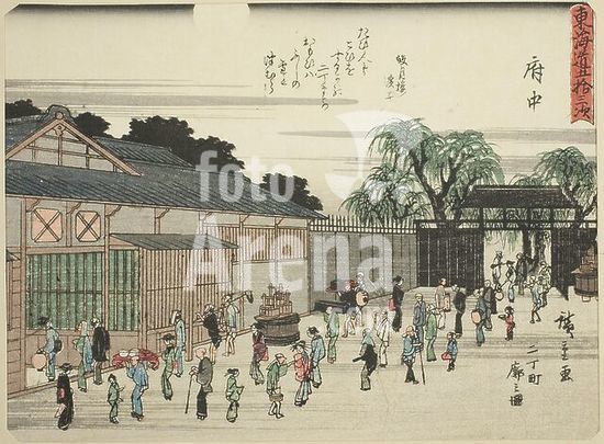 alb4154357 Fuchu, from the series "Fifty-three Stations [of the Tokaido] (Gojusan tsugi)," also known as the Figure Tokaido (Jinbutsu Tokaido). Utagawa Hiroshige ?? ??; Japanese, 1797-1858. Date: 1852. Dimensions: 25.4 x 18.1 cm (10 x 7 1/8 in.). Color woodblock print; chuban. Origin: Japan. Museum: The Chicago Art Institute, USA.