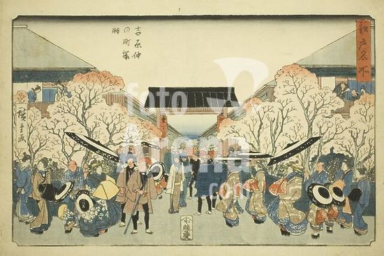 alb4153744 Cherry Blossom Season at Nakanocho in the Yoshiwara (Yoshiwara Nakanocho sakura toki), from the series "Famous Places in Edo (Edo meisho)". Utagawa Hiroshige ?? ??; Japanese, 1797-1858. Date: 1834-1847. Dimensions: 25.6 x 37.3 cm (10 1/16 x 14 11/16 in.). Color woodblock print; oban. Origin: Japan. Museum: The Chicago Art Institute, USA.