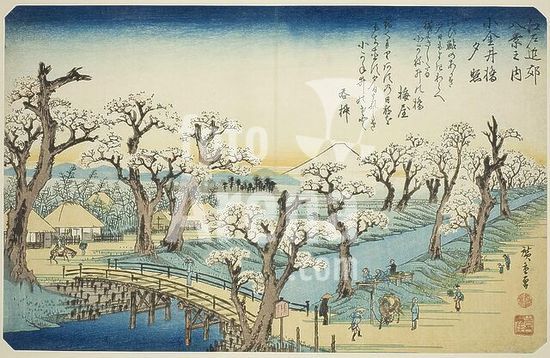 alb4153829 Sunset Glow at Koganei Bridge (Koganei-bashi sekisho), from the series "Eight Views in the Environs of Edo (Edo kinko hakkei no uchi)". Utagawa Hiroshige ?? ??; Japanese, 1797-1858. Date: 1832-1843. Dimensions: 35 x 22 cm. Color woodblock print; oban. Origin: Japan. Museum: The Chicago Art Institute, USA.