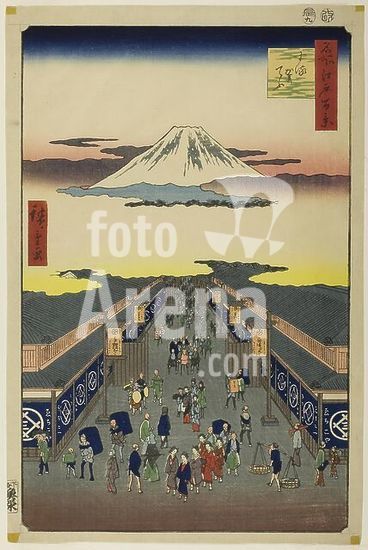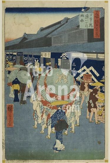 alb4154481 View of Nihonbashi Tori-itchome (Nihonbashi Tori-itchome ryakuzu), from the series " One Hundred Famous Views of Edo (Meisho Edo hyakkei)". Utagawa Hiroshige ?? ??; Japanese, 1797-1858. Date: 1858. Dimensions: . Color woodblock print; oban. Origin: Japan. Museum: The Chicago Art Institute, USA.