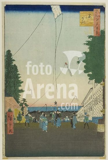 alb3633924 Dye House at Konya-cho, Kanda. Artist: Utagawa Hiroshige (Japanese, Tokyo (Edo) 1797-1858 Tokyo (Edo)). Culture: Japan. Dimensions: H. 13 in. (33 cm); W. 8 1/2 in. (21.6 cm). Date: 1857.In Hiroshige's day, anybody who knew Edo could recognize the city's three most prominent landmarks: distant Mount Fuji, Chiyoda Castle, and Nihon Bridge. Thus, the inclusion of the castle nestled in the townscape and Mount Fuji on the horizon leaves no doubt that this is an Edo scene. But while these features were de rigueur in depictions of the capital, positioning the viewpoint amid the windblown textiles of a dyer's drying platform was Hiroshige's innovation. He views Edo from Konya-cho, a street in the tradesmen's section of town where all the professional cloth dyers were clustered.The strips of cloth hanging in the wind are to be cut into tenugui (or towels), which men tie around their heads during the autumn festival. Thus, we know that autumn is depicted here and that the festival is near at hand.Again, cropping is used to thrust the dynamic forms of the foreground subject matter virtually on top of the viewer. The juxtaposition of various sizes of textiles, hanging like banners, lends an animated sense of rhythm to the composition. A small bird flying by itself in the middle of the sky adds a piquant touch. Museum: Metropolitan Museum of Art, New York, USA.