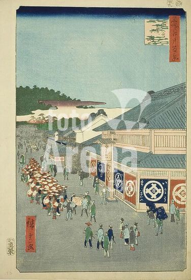 alb3606102 Picture of the Theatres in Sakai Cho. Artist: Utagawa Hiroshige (Japanese, Tokyo (Edo) 1797-1858 Tokyo (Edo)). Culture: Japan. Dimensions: H. 8 15/16 in. (22.7 cm); W. 13 5/8 in. (34.6 cm). Museum: Metropolitan Museum of Art, New York, USA.