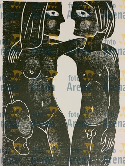 CIRO2604082096 Título: Paraiso. Integra o classico album "São Sarue" lançado no ano de 1981, junto com outras 11 artes. Participou em 2022 da exposição "Corpo" realizada no Museu de Curitiba PR, junto com renomados artistas, como Picasso, Cezane, entre outros. . Técnica: xilogravura. Dimensões: 30 cm x 40 cm. Imagem feita com celular. Acervo pessoal
