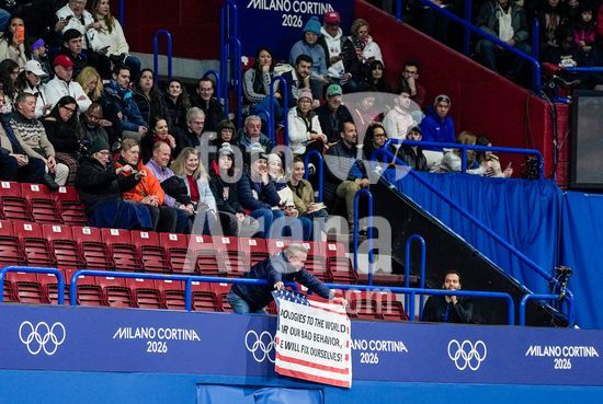 ny070226161011 A fan shows a sign on a United States flag during men?s figure skating at the 2026 Milan Cortina Winter Olympics in Milan, on Saturday, Feb. 7, 2026. (Vincent Alban/The New York Times/Fotoarena)