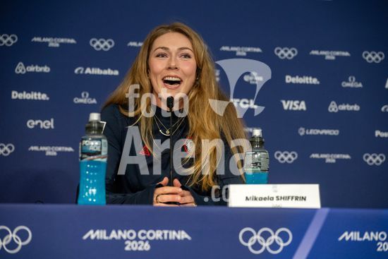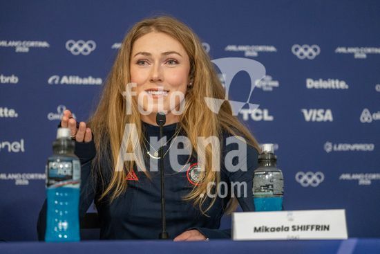 ny070226160012 United States skier Mikaela Shiffrin answers questions during the 2026 Milan Cortina Winter Olympics at the Cortina Curling Olympic Stadium in Cortina d'Ampezzo, Italy, Feb. 7, 2026. (James Hill/The New York Times/Fotoarena)