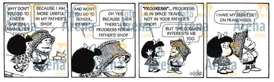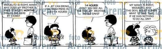 TIRA MAFALDA, CÓDIGO ORIGINAL 1805, INGLÊS, EDICIONES DE LA FLORDiálogoMafalda: Travelling at high speed along avenue block early yesterday morning a car driven by a man and with one passenger on board, plate number a... If cars want to commit suicide, so be it. What I don't understand is why they do it wirh people inside.