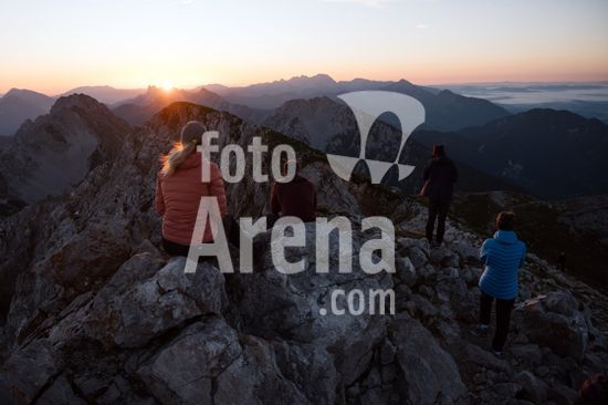 ny300925165811 Hikers take in the sunrise from the top of Stol mountain, the highest peak in the Karavanke Alps, near Slovenia?s border with Austria, in September 2025. The writer traveled from the mountains to the country?s Adriatic coast on his 10-day trip. (Ciril Jazbec/The New York Times/Fotoarena)