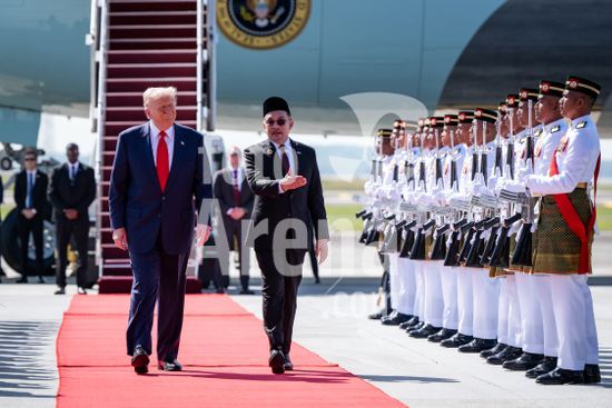 ny311025084814 HEADLINE: On Asia Tour, Agenda Short on U.S. IdealsCAPTION: President Donald Trump, left, is welcomed by Prime Minister Anwar Ibrahim of Malaysia upon his arrival in Kuala Lumpur on Sunday, Oct. 26, 2025. Several of the leaders Trump will encounter on his trip to Asia are either autocrats or presiding over fragile democracies. And some admire his willingness to break the rules. CREDIT: (Haiyun Jiang/The New York Times/Fotoarena)