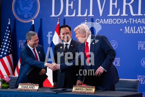 ny261025124411 President Donald Trump shakes hands with Cambodian Prime Minister Hun Manet, left, as Thailand's Prime Minister Anutin Charnvirakul watches during a signing of a ceasefire agreement between Thailand and Cambodia at the ASEAN Summit in Kuala Lumpur, Malaysia, on Sunday, Oct. 26, 2025. (Haiyun Jiang/The New York Times/Fotoarena)