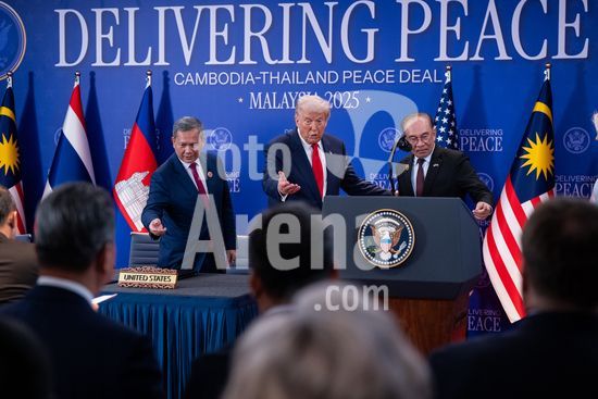 ny261025124415 President Donald Trump, center, gestures to Malaysian Prime Minister Anwar Ibrahim, right during a signing of a ceasefire agreement between Thailand and Cambodia at the ASEAN Summit in Kuala Lumpur, Malaysia, on Sunday, Oct. 26, 2025. (Haiyun Jiang/The New York Times/Fotoarena)